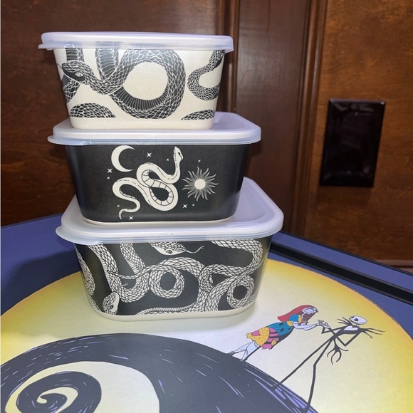 This is a set of 3 food containers with lids by rethink that feature snake designs, perfect for Halloween and all year! The largest one measures 5”x5”x2” and the others fit within it.