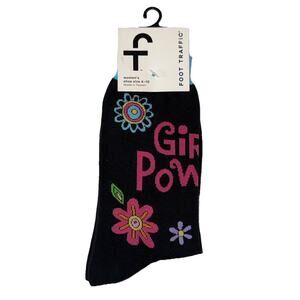 Foot Traffic Women's Girl Power Flower Print Black Pink Crew Socks Size 4-10 NWT