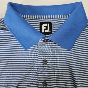 FootJoy men's performance polo shirt. Blue and white stripe print. Collar with three button close. Embroidered logo on back of neckline. Short sleeves.
