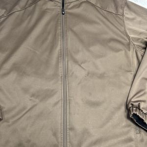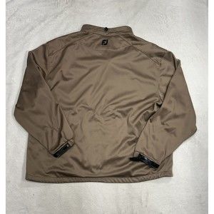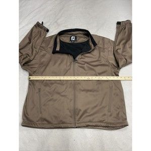 FootJoy FJ Brown Full Zip Fleece Lined Mock Neck Golf Jacket Men's Size 2XL. The strap on the right sleeve has come undone. Please see pictures for condition and measurements for proper sizing and fit.