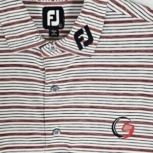FootJoy FJ Polo Shirt Men Large Tour Issue Golf Logo Striped Read. Some waviness in the fabric on the collar, pictured. And some wear to the back tag. Otherwise, in good Pre-owned condition. Care tag has been removedPlease see All photos. Price Reflects condition.
