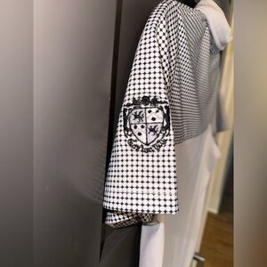 Stylish golf polo shirt with a classic collar. Features a black and white pattern. Perfect for casual or semi-formal occasions.