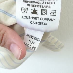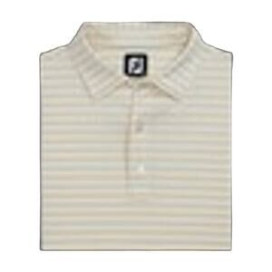footjoy men's polo shirt size extra large cream yellow blue stripe golf shirts athletic golfing top SKU number 29565 breathable lightweight short sleeve length 32 flat across under arm 26 gently pre-owned condition