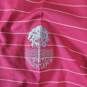 FootJoy men's performance polo shirt. Pink with white stipe print. Collar with three button close. Embroidered logo on back of neckline. Small embroidered golf club logo on one sleeve. Short sleeves.