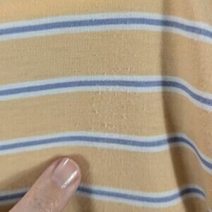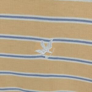 Classic polo styling with light blue and white horizontal stripes on a tan background