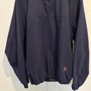 FootJoy, golf windbreaker, pullover jacket, rain pullover, golf outerwear, FJ logo, men's golf jacket, lightweight layer, navy golf top, water resistant, fall golf apparel, elastic hem