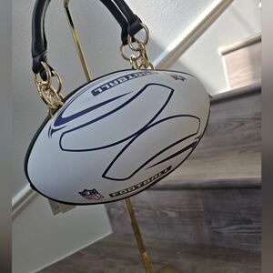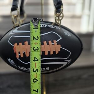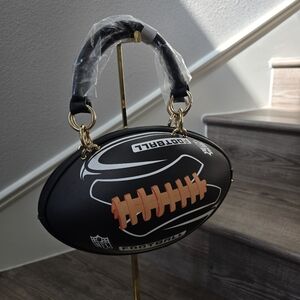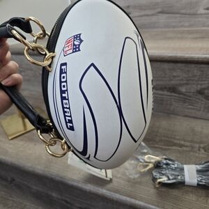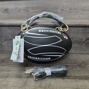 Stylish football-themed handbag for women. Features a unique design with black and white colors. Perfect for sports enthusiasts.