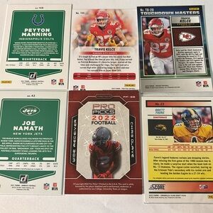 Set of six football trading cards featuring various players. Vibrant colors and dynamic action shots.