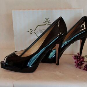 From the iconic Napa Valley boutique. New in the box. Style: Lover. Black patent peep toe platform heels. Hidden platform. Size 10.50 (11.25 long, 3.50 wide, .75 inch platform, 5 inch overall heel height. ) Gorgeous, classic and NEW.