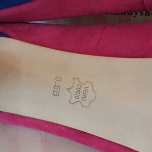 From iconic Napa Valley boutique. New in the box with dust bag. Fushia, red and royal blue suede leather heels. Metallic trim. Tiny cut outs. Size 8.5 measures 3.25 wide, 11 long, 1.25 platform, 5.5 inch heels over 1.25 inch platform. Stunning and NEW.