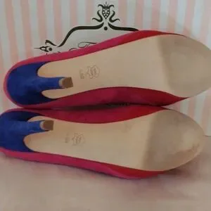 From iconic Napa Valley boutique. New in the box with dust bag. Fushia, red and royal blue suede leather heels. Metallic trim. Tiny cut outs. Size 8.5 measures 3.25 wide, 11 long, 1.25 platform, 5.5 inch heels over 1.25 inch platform. Stunning and NEW.