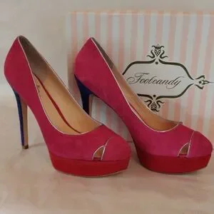 From iconic Napa Valley boutique. New in the box with dust bag. Worn only to try on. Fushia, red and royal blue suede leather heels. Metallic trim. Tiny cut outs. Size 9 measures 3.25 wide, 11.25 long, 1.25 platform, 5.5 inch heels over 1.25 inch platform. Stunning and NEW.