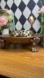 - Lightweight molded composite bowl with deep relief, metallic antiqued surface, and three-footed base