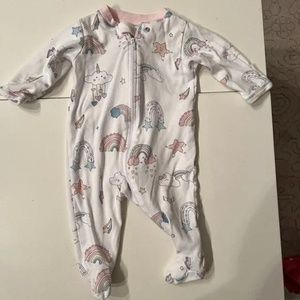 This is a listing for a pair of Noomie footed pajamas for 0-3 months. These have been worn a few times and have unicorns, rainbows and other images.