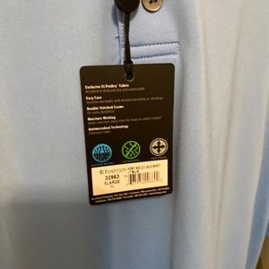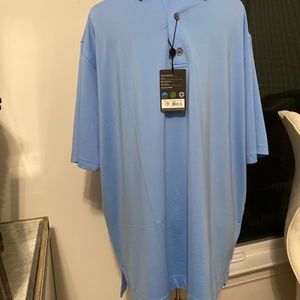 Light blue with strips interior collar and is easy care moisture wicking fabric untucked relaxed fit