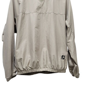FootJoy windbreaker jacket is in size XL for men, designed with a solid tan color and a logo accent. Made of polyester microfiber, it features long sleeves and a pullover closure. Ideal for activewear and casual occasions, this mid-length jacket is suitable for golfing in winter, fall, and spring. It offers a regular fit and is part of the FootJoy product line. Made in Malaysia.
