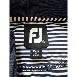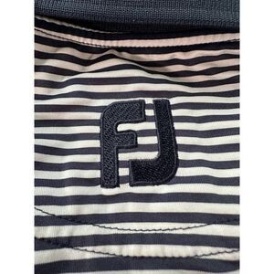 Footjoy Golf Polo Mens White Navy Striped Short Sleeve Shirt. Size large. In great condition! Button up neck. Embroidered flag logo on the left chest. FJ embroidered on the upper back.