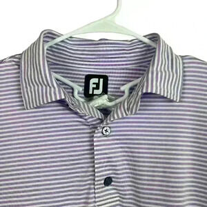 Show off your love for golf with this FootJoy men's performance shirt. The shirt features a stylish striped pattern with a collared neckline and short sleeves, making it perfect for a day out on the course. The shirt is made of a lightweight polyester and spandex blend, ensuring a comfortable fit during your game.