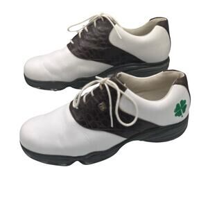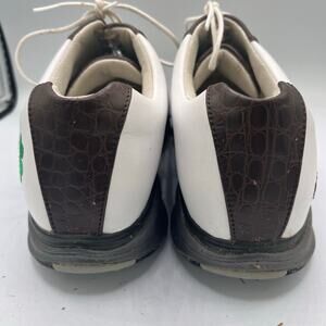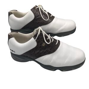 This pair of Footjoy leather women’s golf shoes have a traditional wing tip design, white with crocodile detail on the upper. AMC and Shamrock logos on the sides.