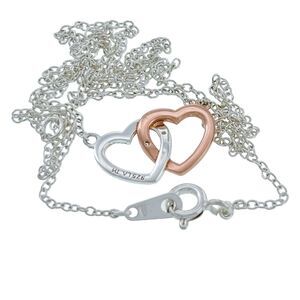 Keywords: Footnote necklace, intertwined hearts, two-tone finish, cubic zirconia, sterling silver, adjustable length, 925 marked, LA marked, elegant accessory.