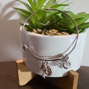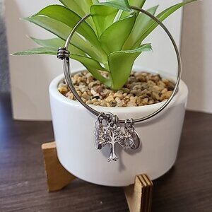 Elegant bangle bracelet by Footnotes, showcasing a polished silver tone finish and adorned with meaningful charms. This bracelet features a classic bangle design that easily slips on and off the wrist, complemented by a trio of charms: a detailed Tree of Life charm with gold accents and sparkling stones, along with two smaller, complementary charms. The Tree of Life symbolizes growth, strength, and connection to nature, making this piece not only a stylish accessory but also a meaningful keepsake. Perfect for adding a touch of sophistication to everyday outfits or for gifting to someone special, this bracelet is ideal for casual outings, family gatherings, or as a thoughtful present for a loved one.