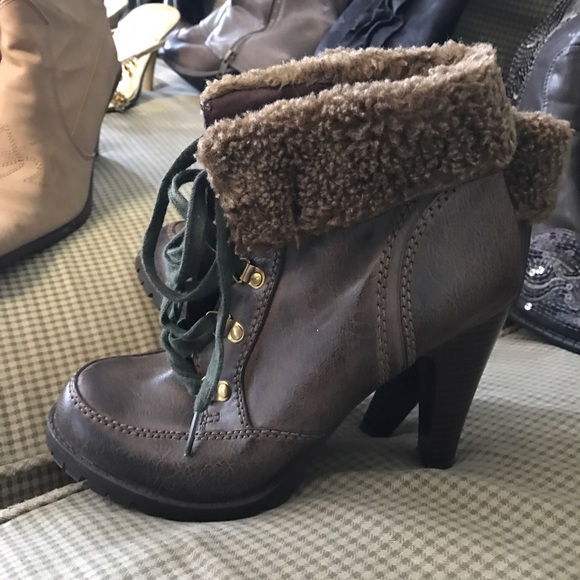 Brown lace up ankle, heel boots with wooly type fur cuffed at top. Army green laces to top it off. Gently warn. Great pair of boots for the fall and winter seasons.