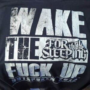 Own a piece of metalcore history with this For All Those Sleeping Band T-Shirt, originally sold during the Outspoken Tour 2012. Featuring bold front graphics that say “Wake the F Up”, this shirt captures the raw energy of the band’s live shows. Printed on a Gildan black tee, size XL, it’s perfect for fans of early 2010s metalcore and post-hardcore scenes.