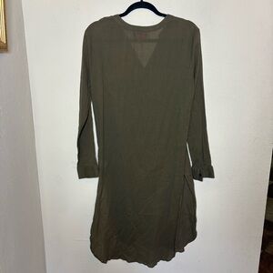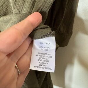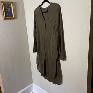 This gauzy olive green swim cover by For Cynthia features long sleeves, and a flattering V-neckline. Buttons down the front and higher slits on the sides. Very airy and in excellent used condition. 100% cotton.