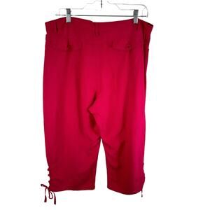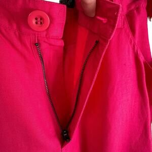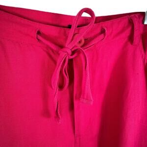 Excellent preowned condition. Hot pink high rise lightweight cropped capri woven pants. Have tie detail on lower outer leg. Zipper/button closure & drawstring. Open pockets on front at waist/button flap pockets on back. Linen/viscose material. Approx. measurements: Waist 34", inseam 18", rise 12". Size L.