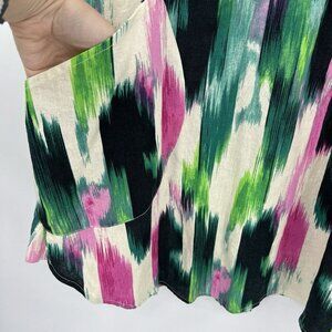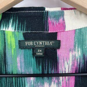 For Cynthia Linen Blend Artsy Tunic Top 2X Roll Tab Sleeve Lagenlook Green Pink