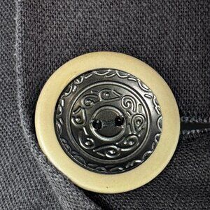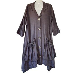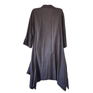 For Cynthia Linen Blend Button-Front Lagenlook Midi Shirt Dress Button Front with Large Buttons and Oversized Slouchy Side Pockets with Smocked Detail has 3/4 Sleeves and Handkerchief Hem Oversized flowy loose and comfortable dress is Graphite Grey with Point Collar and V-Neck Could be worn as a Coat or Jacket Asymmetric Hem Minimalist Modest Neutral Career Business Teacher Academia Goth Whimsigoth Witchy Witchcore Harry Potter Alternative BOHO Bohemian Hipster Folklore Fairyfolk Funky Artsy Art to Wear Unique Avant Garde Solid Color