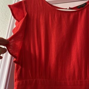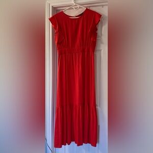 For Cynthia Linen blend tiered maxi bright coral dress with flutter sleeves