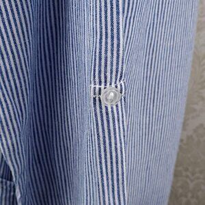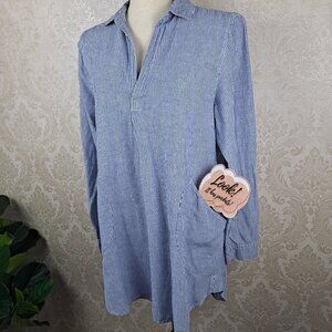 This tunic length top is a linen/cotton blend in a blue and white vertical stripe. Split v-neck leads up to a traditional shirt collar. Long sleeves have a roll tab with button closure and a button at the cuff. Longer length in the back. Front pockets. Rounded hemline. Easily pairs with leggings or pants.