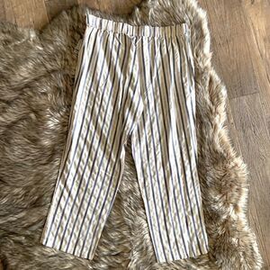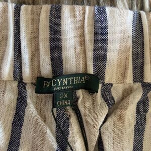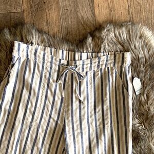 For Cynthia Striped Linen Blend Wide Leg Pants.Drawstring, navy/beige/tan stripes •Comfortable, classic pants with a linen blend•55% Linen 45% Viscose•Back elastic waist•Approximate measurements: Length 42", Waist 20” across", Inseam 30" . Thank you for stopping by my closet!!!