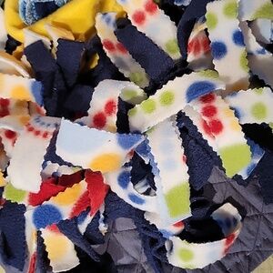Stimulating colors are used to encourage enrichment and play: polk-a-dot multi-color fleece pattern, yellow pots, and blue buds.