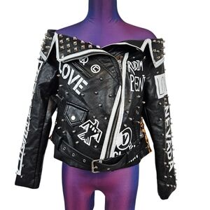 For Her NYC Black Faux Leather Graffiti Studded Off the Shoulder Jacket Large