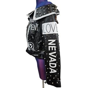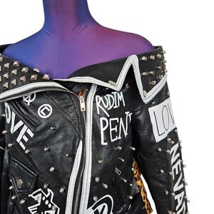 Features black faux leather moto jacket, off the shoulder with studded moto collar, slant zipper closure, attached front buckle belt, white graffiti, back faux fur leopard print with patches, allover studs rivets, streetwear, long sleeve with zipper sleeves, cropped, satin lined.