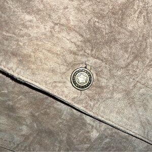 100% soft suede with a gorgeous gold satin lining. Branded engraved western sheriff style buttons all the way to the top. Dual breast pockets. Buttoned cuffs.