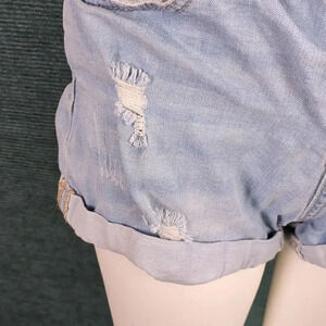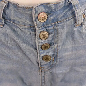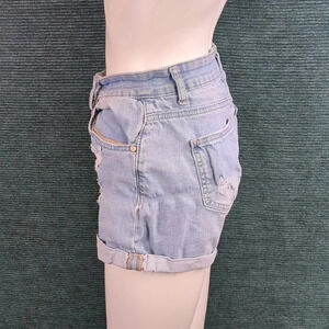 Distressed high waisted button fly shorts.