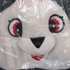 It is white with pink in ears, red on eyes, pink and red tongue, black accents and black brim.