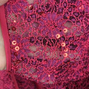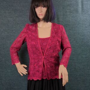 This camisole style tank top and light jacket leans toward a burgundy red with purple background. The material is a purple lace that has been basically embroidered with red satin. It also has red sequins sewn on. The hems are scalloped, and the neckline has satin trim.