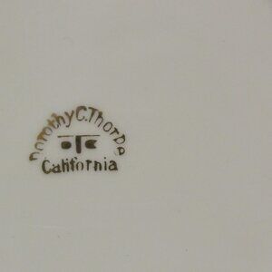 7 bread & butter plates @ $10, 2 salad @ $12 = $94 Vintage, mid-century modern (mcm) Dorothy C Thorpe 6 3/8" bread and butter or salad/dessert plate in Dot 2 pattern. More well known for her hand-painted glassware, this is a harder to find plate that belongs to dinnerware dish set. The pattern is floral (chrysanthemum) in gold, green and white. I do not find any chips or nicks. Other pieces are listed and will combine shipping. I also have more of these if you need more than one replacement piece, let me know and I can make a seperate listing. Made in California.