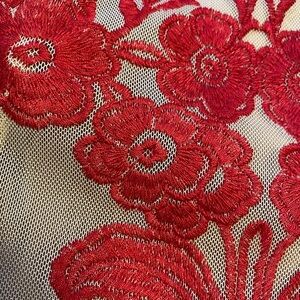This dress is a stunning and romantic piece from For Love & Lemons, featuring a nude mesh base adorned with intricate red floral embroidery. It has a flattering fit-and-flare silhouette, long sheer sleeves with bell-shaped cuffs, and a scoop neckline. The