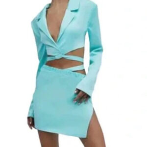 - Elastic waist - Side slit - Hidden back zip closure - Cut out design with waist strap - Satin Aqua * can be paired with the crop blazer top which I do not have for sale. Waist across: 17 in Center length: 16 3/4 in