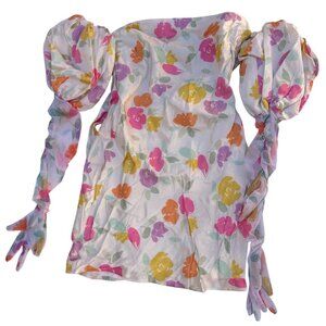 This romantic mini dress by For Love And Lemons features a charming floral print, perfect for any special occasion. Designed with a coquette style, it includes removable gloves for added versatility.