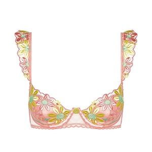When it comes to this pretty pastel bra, there’s no wondering if “She loves me” or “She loves me not.” A spray of colorful daisy appliqués lends a retro pop to its scalloped demi cups and ruffled straps. Make it a set with the matching Daisy Jane panty.