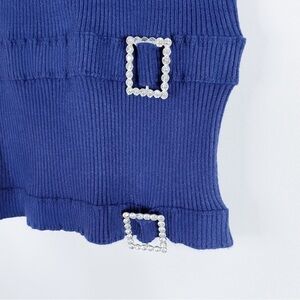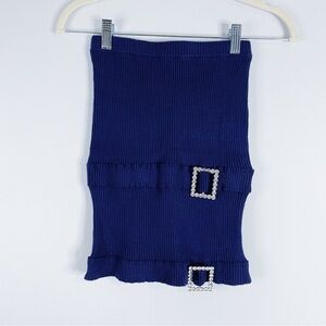 For Love And Lemons ribbed skirt in dark blue. Rhinestone embellished buckle detail at front.