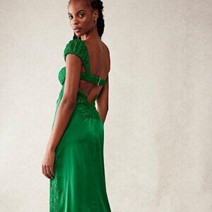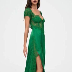 Elegant green maxi dress. Features lace details and side slit. Perfect for special occasions.