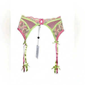 New with tags. For Love And Lemons Hugging Hearts Garter Belt in size XS. This romantic and playful garter belt features sheer pink mesh with heart-embroidered lace, vibrant green trim, satin bows, and adjustable garter straps. Designed to pair with coordinating lingerie, this piece is flirty and feminine—perfect for special occasions or adding a touch of color to your lingerie drawer. Garter belt only; stockings not included. Never worn.