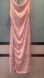 A baby pink floral satin-esque material with an asymmetrical cowl neckline, midi length; flattering slit, and open back.